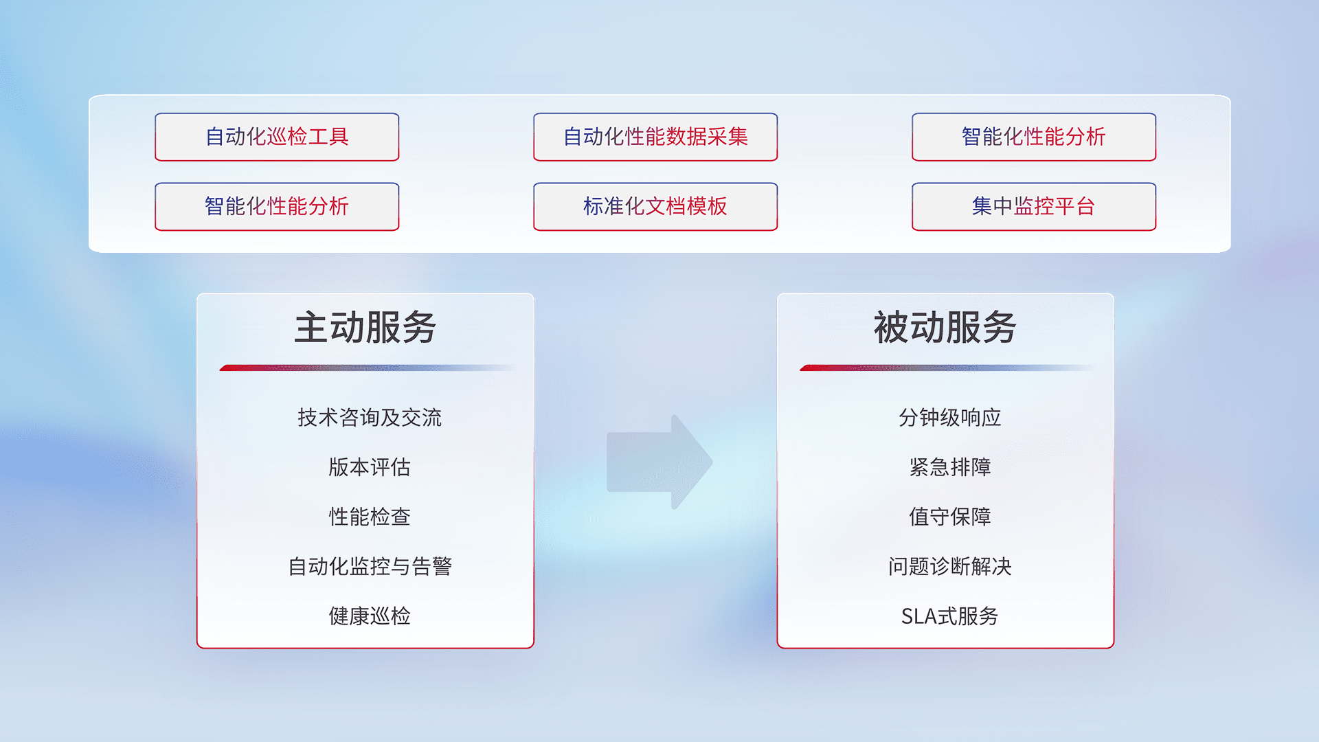 智能化工具和标准化文档,,,保障服务质量,,,,提供主动服务(包含技术咨询、、、、版本评估、、性能检查、、、自动化监控与告警、、健康巡检)和被动服务包含(分钟级响应、、紧急排障、、、、值守保障、、问题诊断解决、、SLA服务)。。。